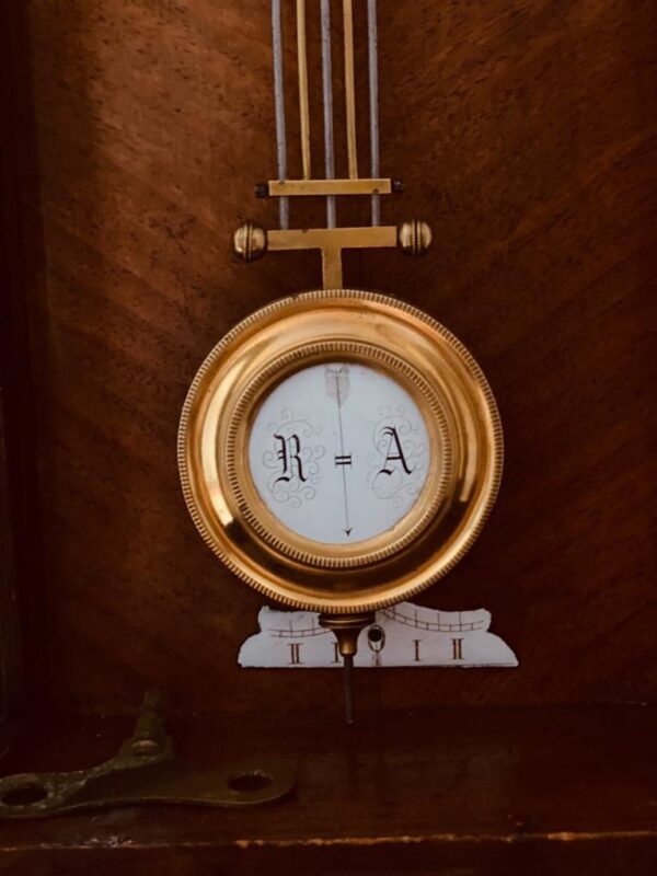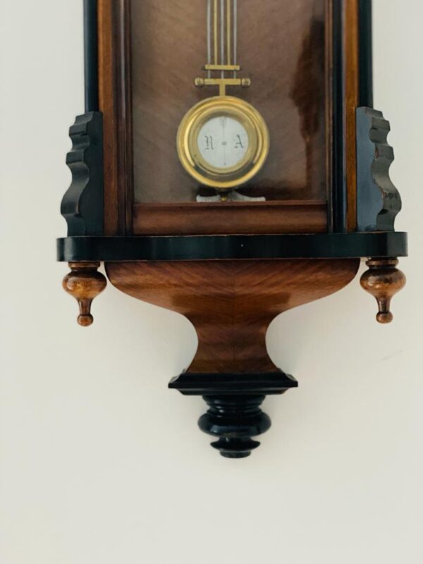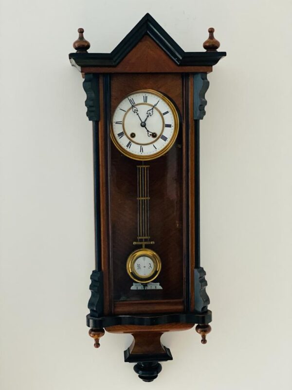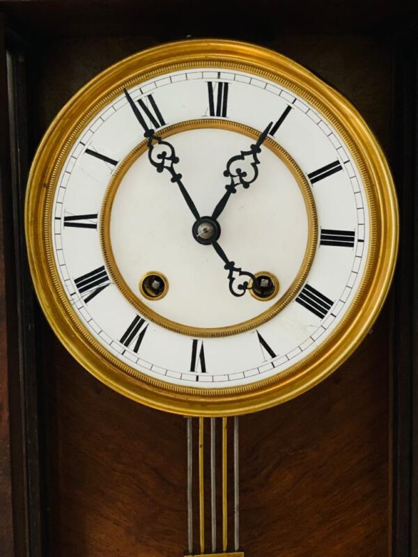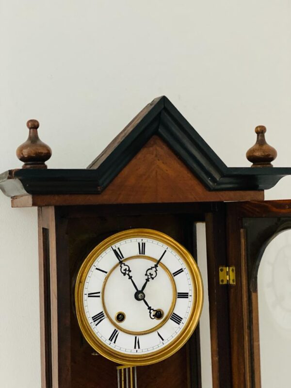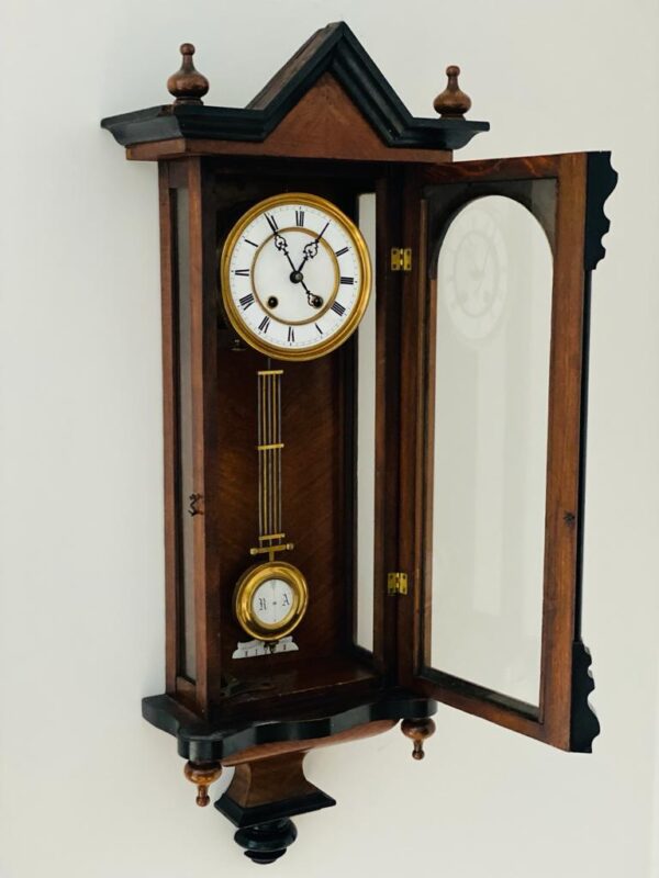 Antique 19th century Minature Vienna Wall Clock. Scissor hands, with a gridayan pendulum. All original finials and pediment. Enamel dial with matching pendulum. Runs for 8 days on a full wind, key incuded.
