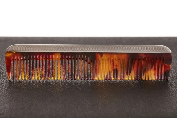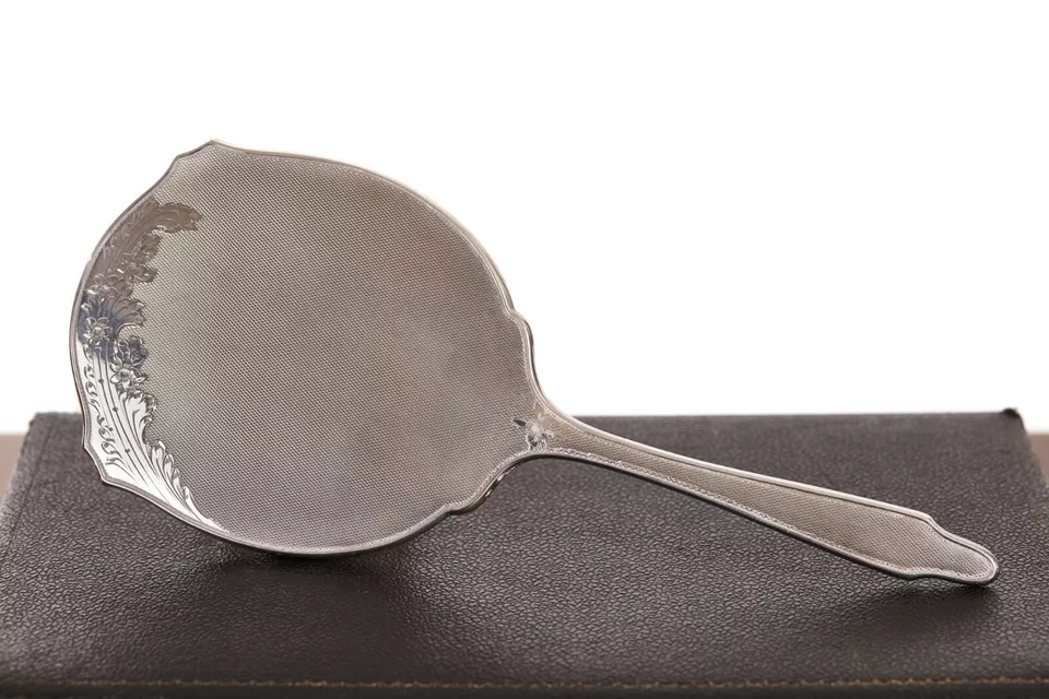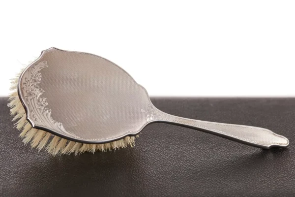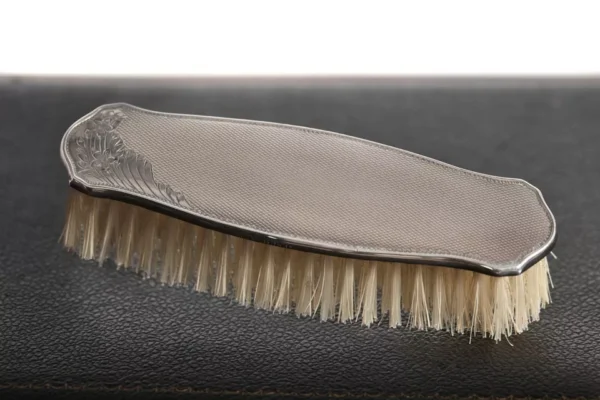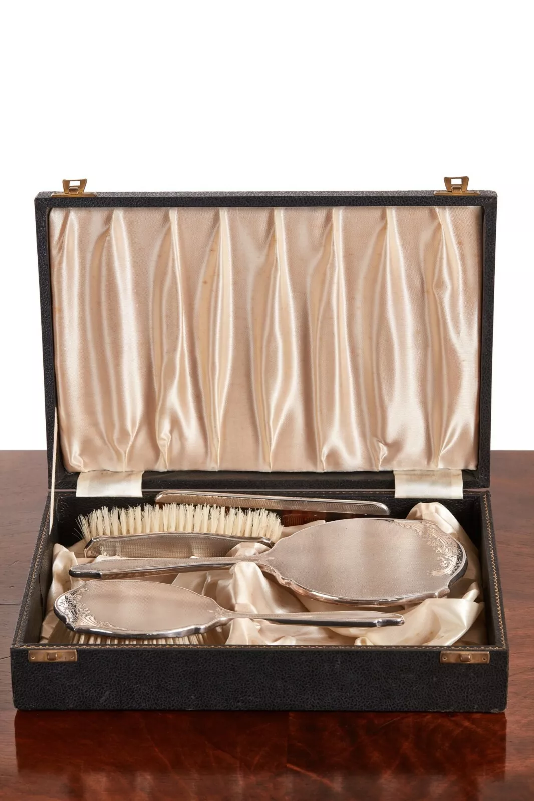 A cased silver four- piece brush set with engine turned and engraved decoration, comprising two brushes, hand-mirror and comb. Early 20th century. Measurements . Length= 8 cm (3″)