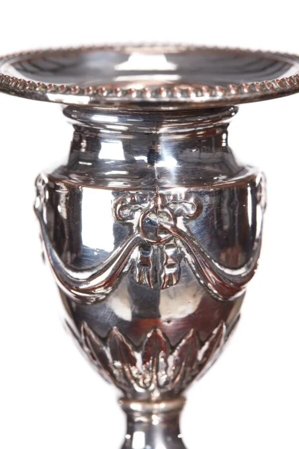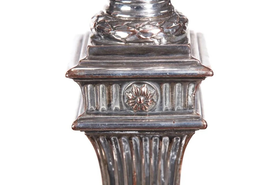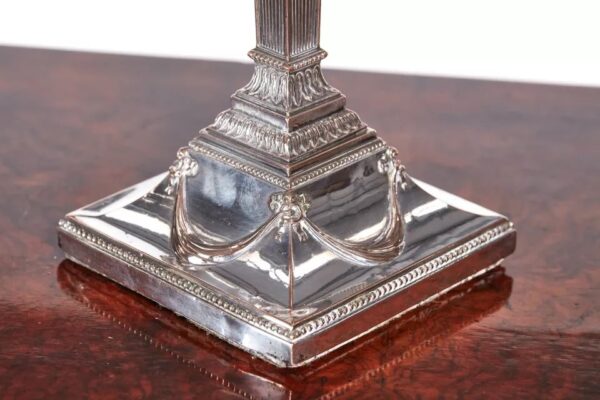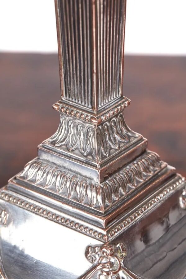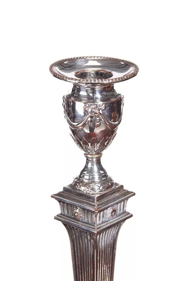Pair of George III silver plated candlesticks, having urn shaped top with ribbon swags and tapering reeded columns on an arched shaped plinth base with ribbon and swags
